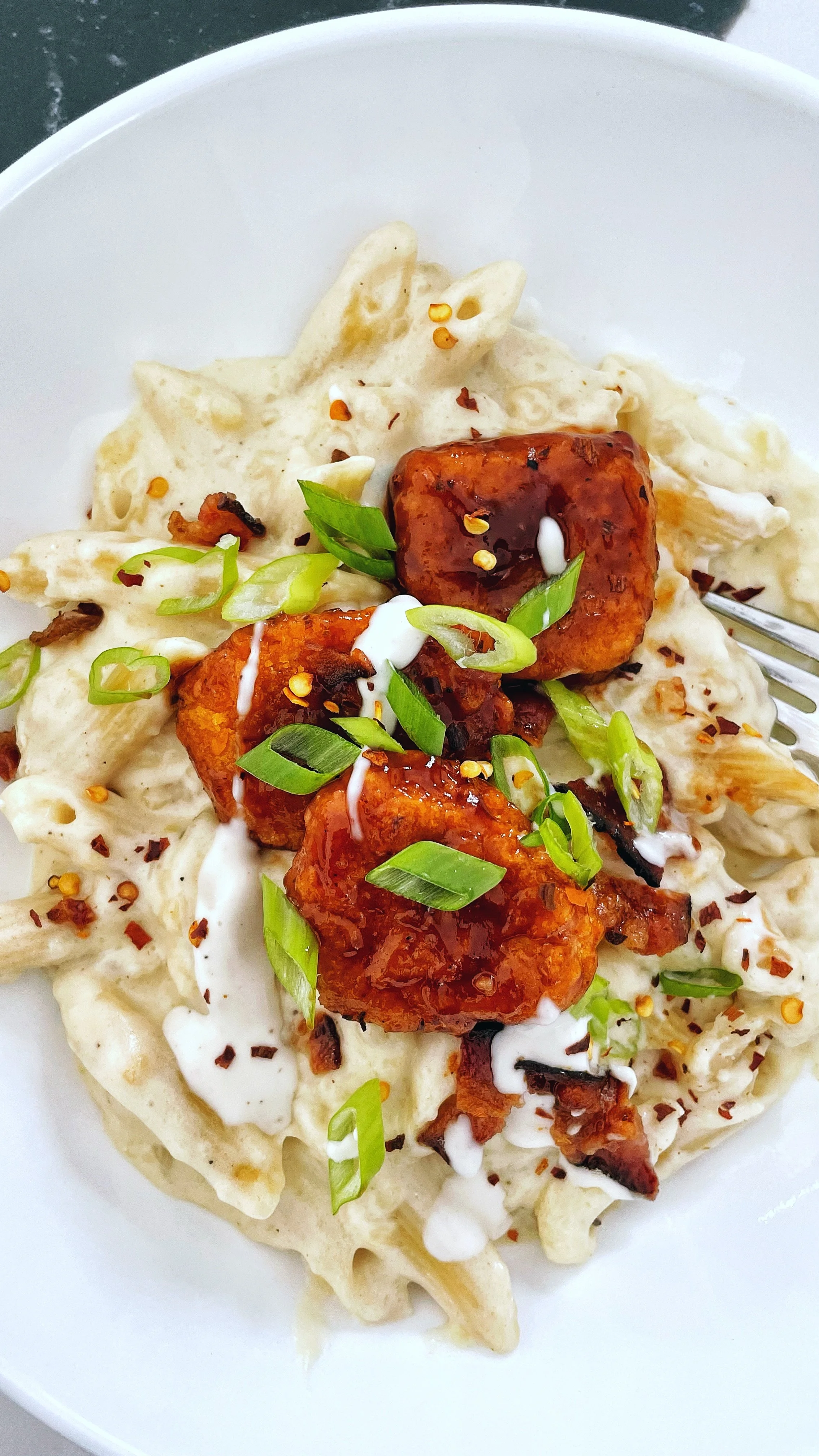 Miso mac and cheese topped with BBQ chicken, bacon, scallions, and ranch.